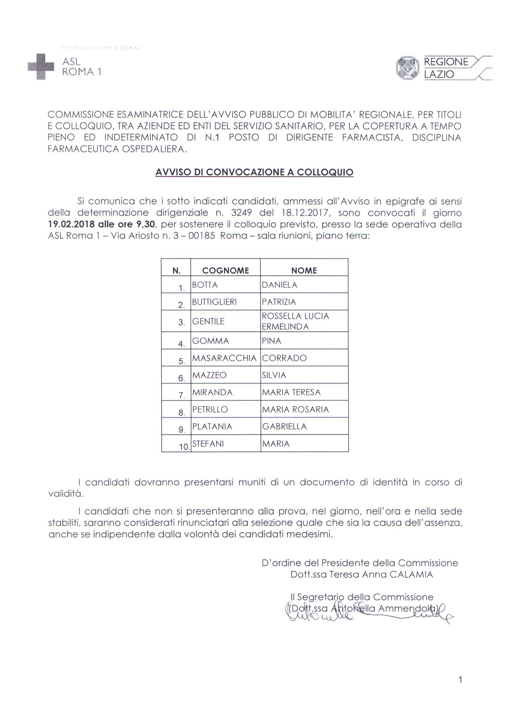 Si comunica che nella sezione Concorsi e Avvisi è stata pubblicata la nota di convocazione a colloquio, relativa all'avviso pubblico di mobilità volontaria regionale, per titoli e colloquio, tra Aziende ed Enti del Servizio Sanitario Regionale, per la copertura a tempo pieno ed indeterminato di n. 1 posto di Dirigente Farmacista, disciplina Farmacia Ospedaliera.