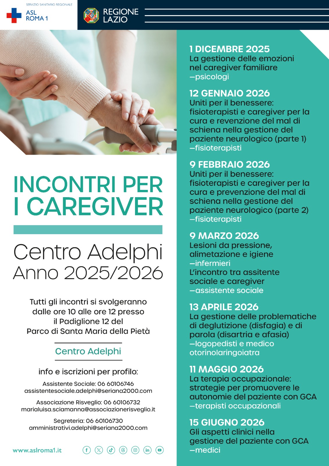 Partecipa agli incontri per i Caregiver organizzati dal Centro Adelphi, che si svolgeranno dalle ore 10:00 alle ore 12:00, presso il padiglione 12 del Parco di Santa Maria della Pietà - Centro Adelphi, nelle seguenti date: