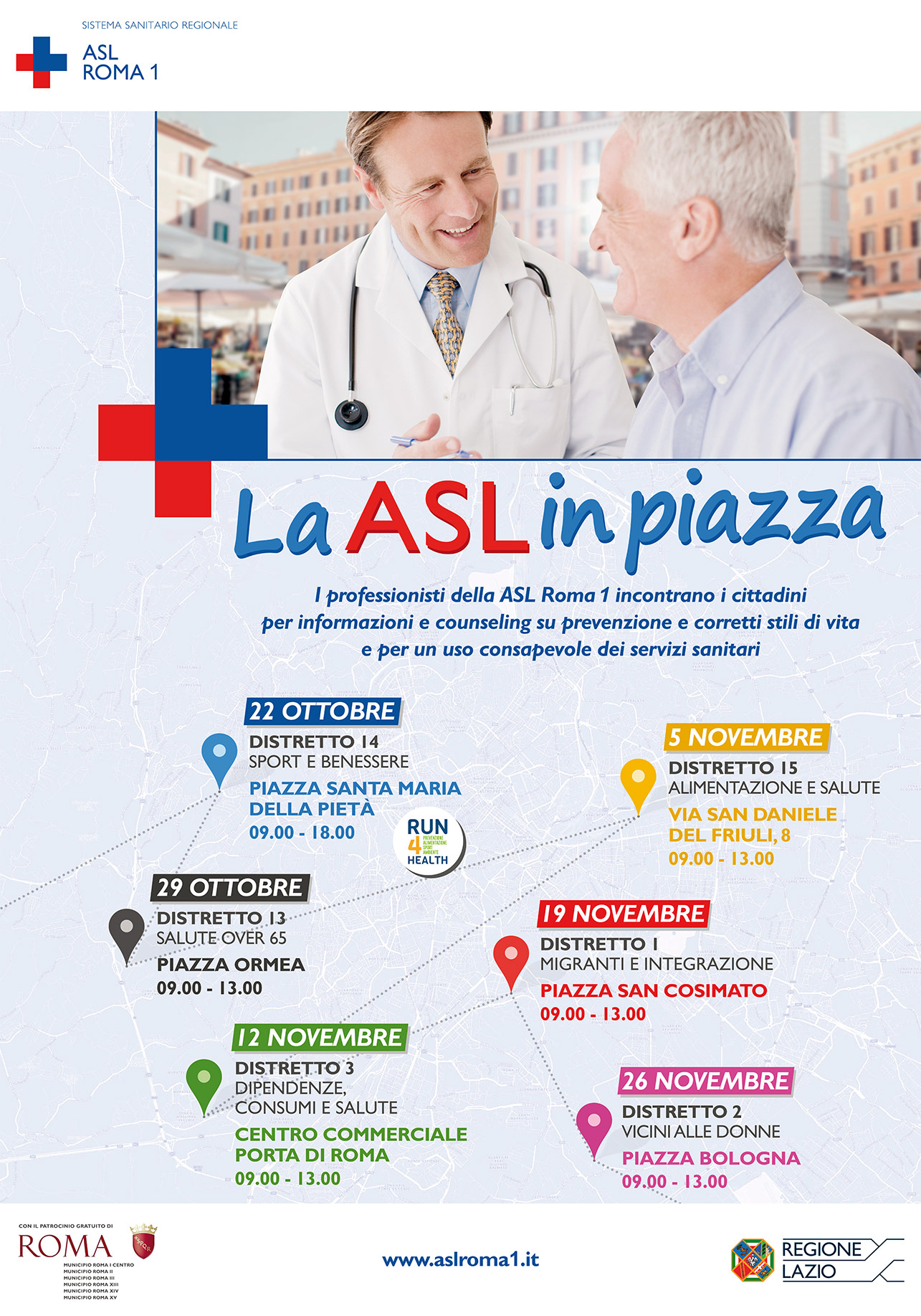 Continua "La ASL in piazza", tour nei sei distretti sanitari che fino alla fine di novembre porterà i professionisti della salute dell'Azienda ogni domenica in una piazza romana. La prossima tappa, prevista per il 29 ottobre, sarà in Piazza Ormea, dalle ore 9 alle ore 13. Protagonisti saranno i medici e gli operatori del Distretto 13, che forniranno informazioni sui servizi, con un occhio di riguardo nei confronti degli over 65. Oltre al tema caldo delle vaccinazioni, spazio anche agli screening oncologici e alla corretta alimentazione. Grazie alla collaborazione con i Medici di Medicina Generale sarà anche possibile effettuare la misurazione della pressione. Non mancate!