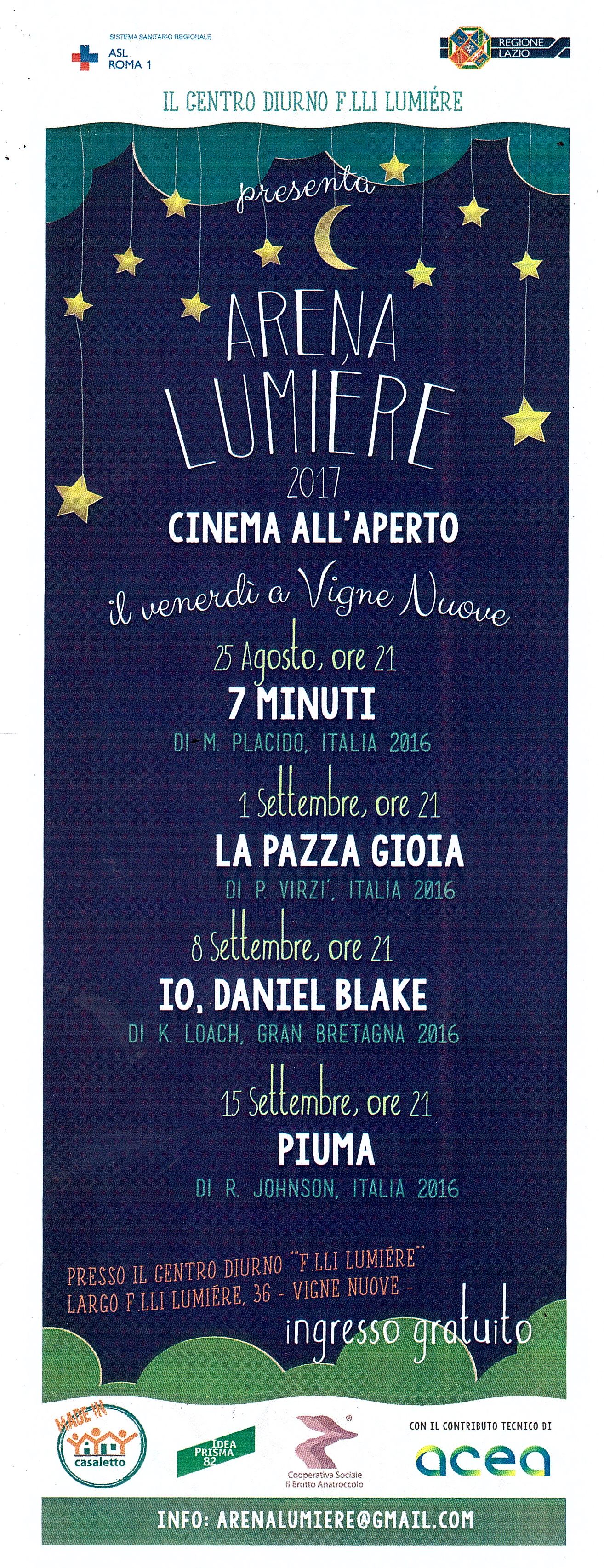 Nuovo appuntamento con Arena Lumière, il cinema all'aperto che ogni venerdì, dal 25 agosto al 15 settembre, si svolgerà nel centro diurno "Fratelli Lumière". Tra i film in programmazione per questo secondo appuntamento estivo "7 minuti", di Michele Placido, pellicola aprirà la kermesse con inizio alle ore 21.00, e "La pazza gioia", toccante lungometraggio di Paolo Virzì dedicato al tema della salute mentale.